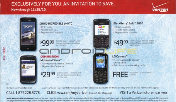 - Motorola Citrus $30 & Droid Incredible $100 In Upcoming Verizon Promotion