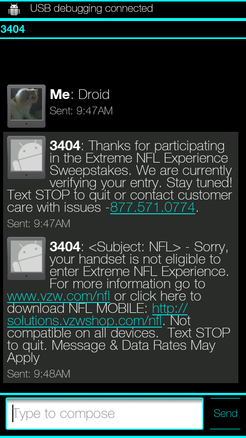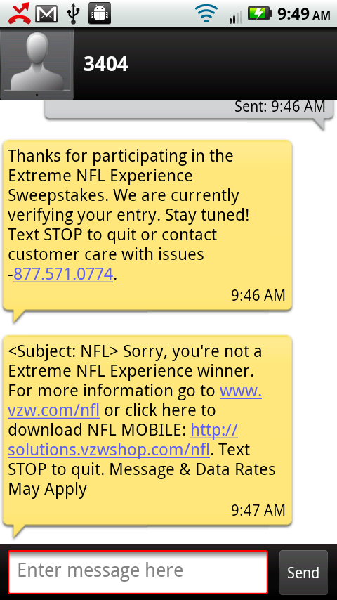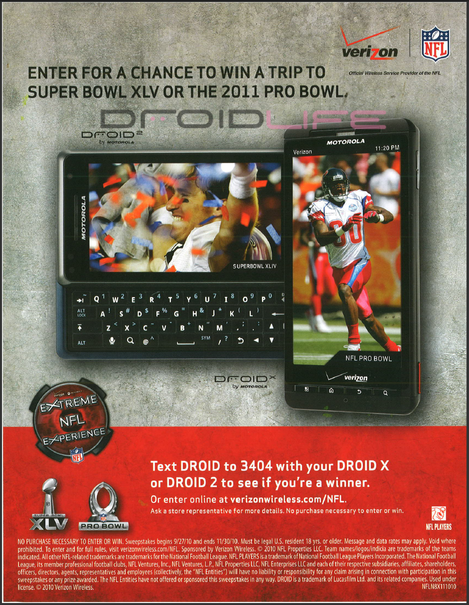 First off, I need to apologize for being a month behind on this announcement, but don’t worry, you still have time to enter! Verizon is running a contest that will send Droid 2 and Droid X owners to either Super Bowl XLV or the 2011 Pro Bowl. All you have to do is text “Droid” to “3404” and you are entered. In fact, you’ll get a response back almost immediately to let you know if you have won or not.