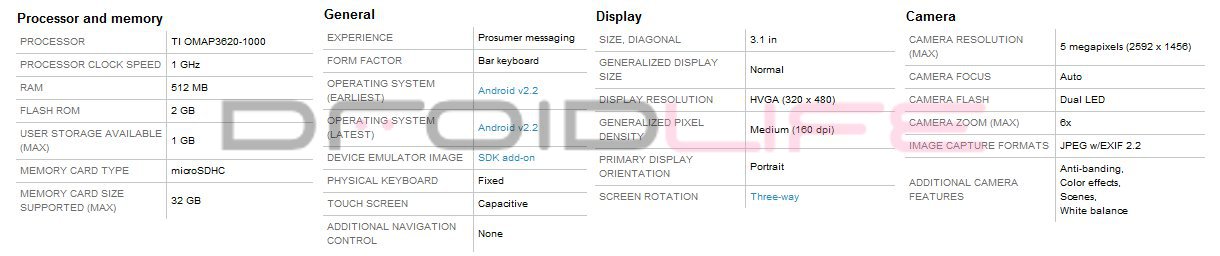 Important specs for the Droid Pro: