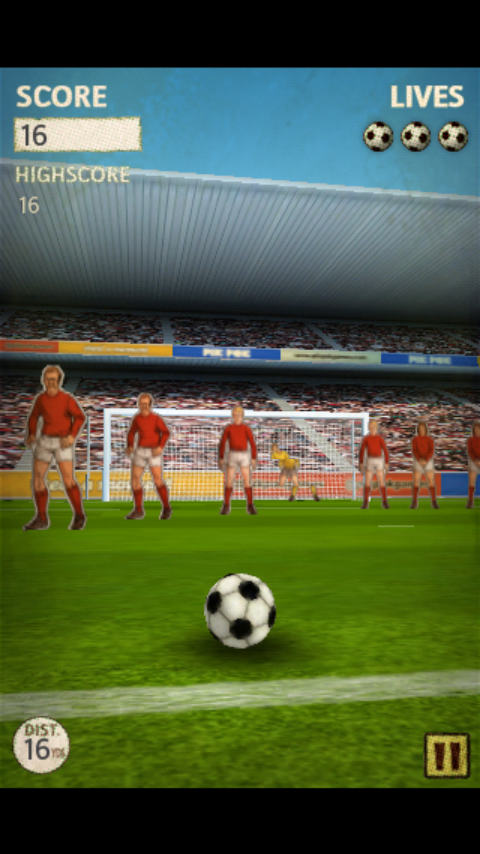 So the game is simple. Kick the soccer ball into the net and try not to nail any of the stand-ups or moving goalies in the face. You can curve the ball with a simple swipe, grab extra lives by hitting the corners, and impress the heck out of your friends with the OpenFeint scoring integration. Seriously, once you master the curved shot, you won’t quit.