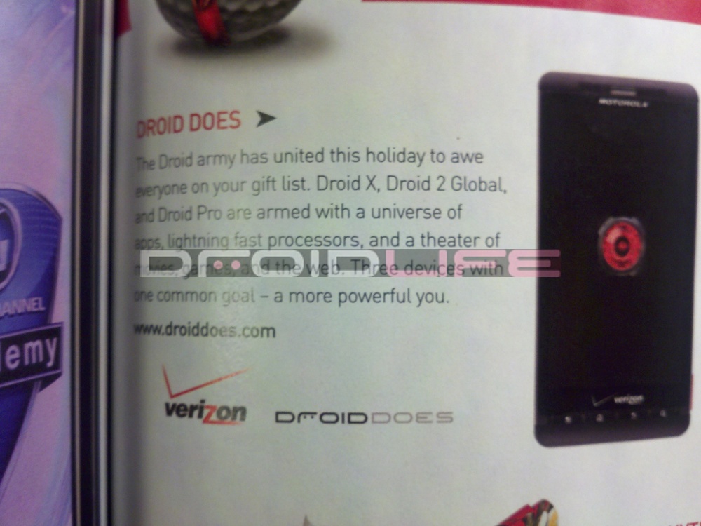 Still unannounced, the Droid 2 Global makes yet another appearance only this time in an actual magazine. As you can see from the shot above, the D2 Global is mentioned alongside the Droid X and Droid Pro as the leaders of the “DROID” brand going into the holiday season.