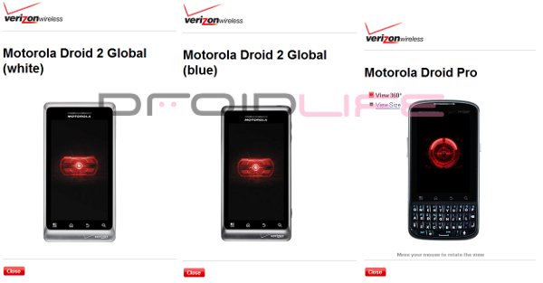 The Droid 2 Global is expected some time in between now and November 29th, the Droid Pro is going on pre-sale tomorrow for $179, and their 360 view pages just snuck onto Verizon’s website. Well, the 360 for the Droid Pro is viewable, but the D2 Global pages are just still images and will likely be pulled any minute now.