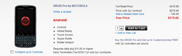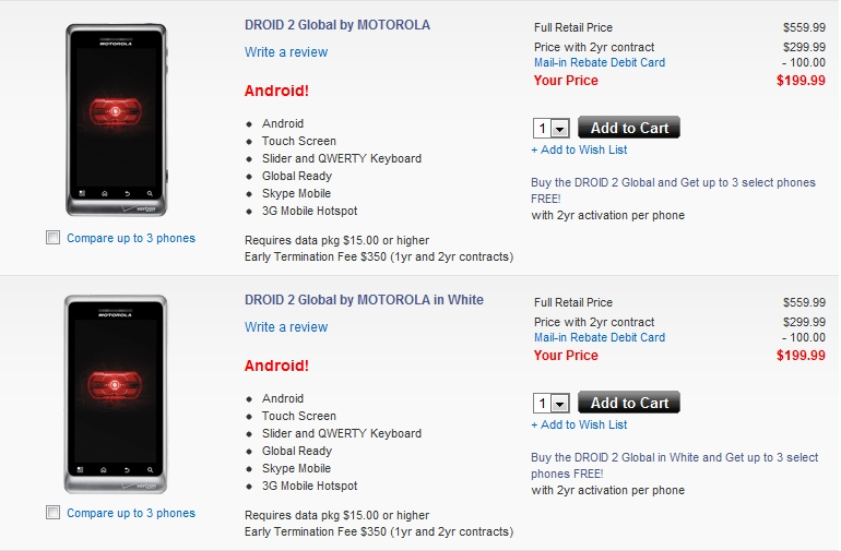 Verizon still hasn’t actually announced the Droid 2 Global, but you can order it now online along with the Droid Pro. The D2 Global can be had for $199 after mail-in-rebate and the Pro for $179 which will help you get your global roaming groove on before the phones hit stores. The D2 Global as we told you will come in “Dark Sapphire” or “Winter White” and the Droid Pro is there to replace your Blackberry should you still be sporting one. Droid franchise for the win?