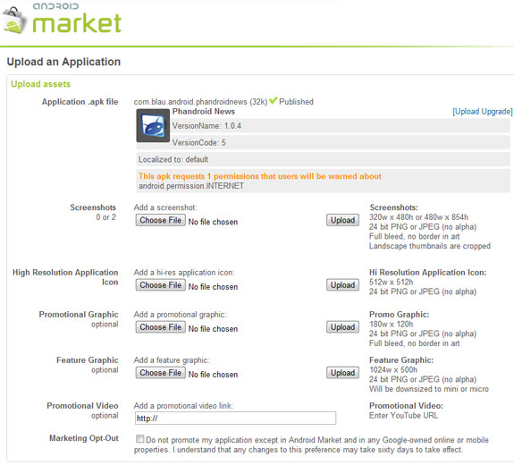 So as you can see in that screenshot, developers are now being asked to include high resolution graphics for their applications plus promotional videos if they have them available. Sounds like things we would see on a blown-up, beautiful version of the Android market running in your browser doesn’t it?