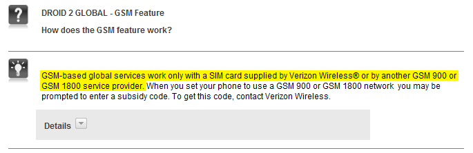 Those of you that purchased a Droid 2 Global or Droid Pro thinking that it would run on AT&T’s network may be a little disappointed to find out that Verizon has quietly blocked it. The hardware of both phones appears to support AT&T’s 850 and 1900 GSM bands, but their may be firmware that is restricting access to them. While I can’t imagine too many people would be surprised by this, it is something to be aware of if you were hoping for some reason to play around on AT&T’s not-so-amazing network. The good news, is that you’ll be fine in the rest of the world and with Verizon’s coverage almost everywhere here in the states, life will go on.