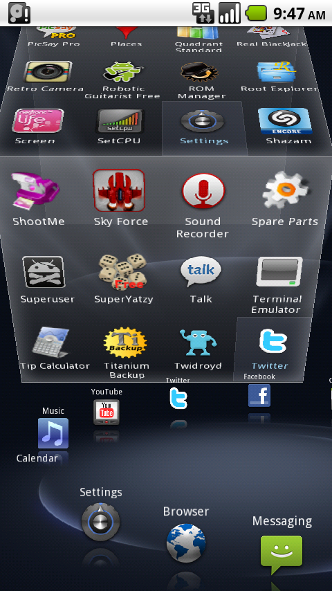 Based around a single circle of icons, you can control every aspect of your phone with a single screen. Two to be exact The second of which is the screen that holds all your applications in a very slick cube design. With built in social network APIs and widget features, I might hold onto this for a bit. Or at least until I miss custom wallpapers.