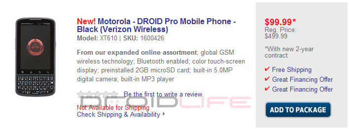 The Droid Pro has only been available in stores for 1 full day and can already be snagged at a steal of a price over at Best Buy. If you don’t want to pay the $179 price at Verizon stores, then how does $99 sound? It also looks like you won’t have to deal with those pesky rebates, but you will of course have to sign a standard 2-year contract. Gotta love the holidays.