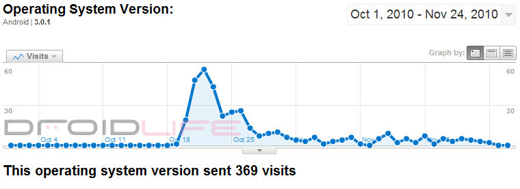 Before you all start digging into piles of stuffing, how about one last pot stirrer? We had a few minutes of spare time and decided to sneak a peak at our Google Analytics which have been known to feature some of the new versions of Android floating around in the wild. We had seen Android 3.0.1 (Honeycomb) in the past, but when we put up a range of dates we noticed something interesting. Traffic coming from an Android 3.0 device spiked on October 22nd and hadn’t made an appearance any other day prior.