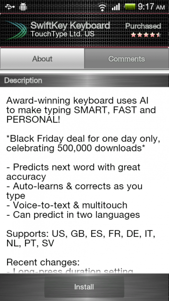 We’ve talked a lot about Swiftkey as one of the top keyboards on the planet, especially when you use it for 5 minutes and realize that it’s smarter than you. Well today, in celebration of their 500,000 download and it being Black Friday, you can snag the keyboard for $1.99 which is half the normal price. If you aren’t familiar with Swiftkey, just understand that it falls under the “predictive text” category which essentially means it does a fantastic job of predicting the next word in the sentence you may be typing. It’s not a Swype-styled keyboard, you actually have to press the buttons, but it does an unbelievable job of getting you to your final output with ease.