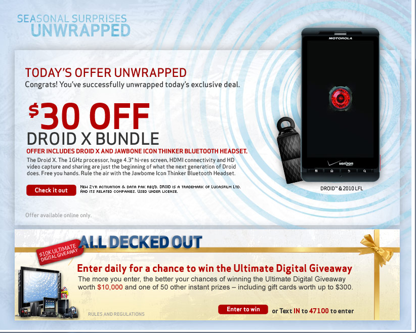Remember those 24 daily “Season Surprise” deals that are expected to come out from Verizon up until X-mas? Today’s is the Droid X! We knew it wouldn’t be long before they tossed in a Droid device, but day 2 of the promo is the type of action we like to see. If you buy the Droid X and Jawbone Icon bundle, you’ll get $30 off, which I’m assuming means the Jawbone is essentially free. Obviously you’ll have to sign up for a new contract and all that jazz as well.