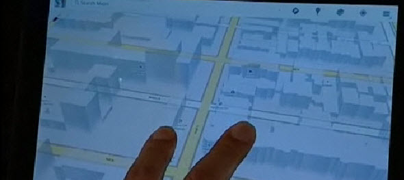 - He showed off Google Maps 5 which will have 3D views of cities. It should be out for mobile devices in a few days.