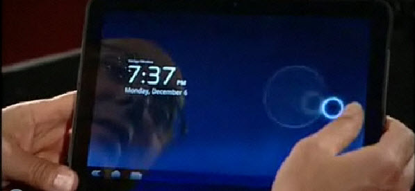 - Showed the new Honeycomb lock screen which had a fantastic new animation. No more swiping bars left or right in Android 3.0. (Pictured above)