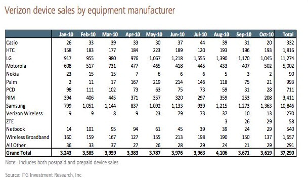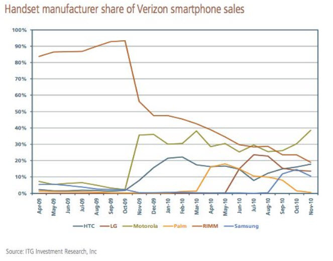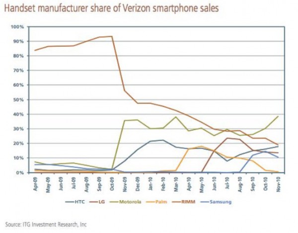 Whoa. We knew that the Droid brand had swooped in to steal smartphone market share from just about everyone including RIM and their Blackberry line, but that chart above puts it on a whole other level. With the introduction of the original Droid and the Eris in October of 2009 on Verizon, you can see when the beginning of the end got its jump start for RIM. And throughout the rest of the year, we saw 5 more “DROID” phones plus a handful of other Android devices land on Big Red that all seem to be the choice for future smart phone goers. While Motorola has already jumped well beyond everyone in terms of overall numbers, Samsung, LG, and HTC will surely overtake RIM as well once 4G LTE devices become available.