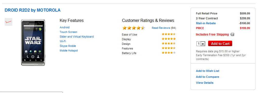 The R2-D2 Droid 2 looks like it may not have been such a hot item after all. With limited amounts of inventory apparently available at launch, the device was supposed to sell out within minutes, only that never happened. With devices sitting on store shelves for almost 3 months now and Verizon unable to sell them, the price has been dropped just in time for a last X-mas push to $199.