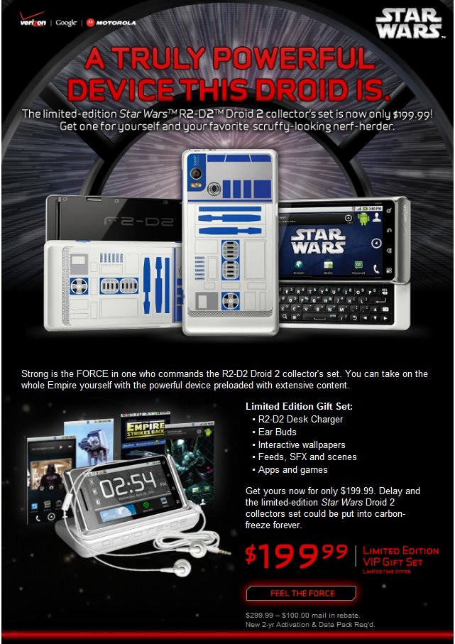 We broke the news yesterday that the R2-D2 Droid 2 had seen a price drop to $199 and this morning, Verizon started telling the rest of world about it. Anyone on the VZW DROID email list should have received this email some time today to try to get them to buy this limited edition Droid. They even made it sound like the device would be sold as a “gift set” that includes a desk charger, ear buds and more, when we all know that stuff came with it from the beginning. Drop that bad boy to $99 and I may think about it.