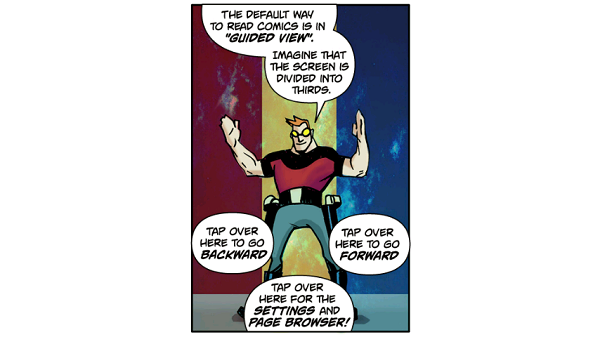 Navigation of comics is achieved through a rule-of-thirds tapping system, along with pinch-to-zoom gestures. This is all well and good, but the program sometimes makes assumptions to where you want to go; the tapping motions sometimes take you panel-to-panel, or top-half of a panel to bottom-half, or page-to-page. It just makes things confusing when they aren’t consistent, so more often than not I’m looking at the fully-zoomed out page, tapping or pinching to zoom in where I want to see. This is a more intuitive system, I find, because the user’s in a lot more control. They don’t have to worry about missing anything, just because the program hasn’t defined it as “in order”. I applaud them for trying, though, and having a comic-based tutorial earns ComiXology points.