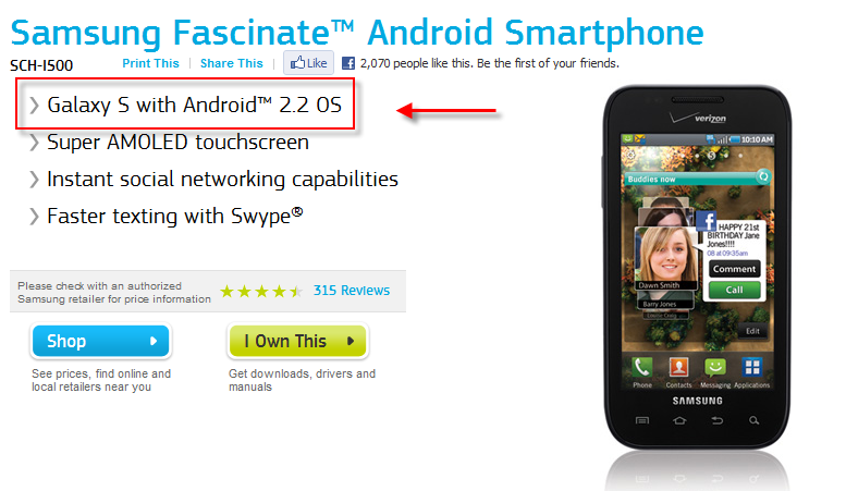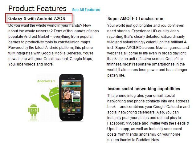 One of our readers dropped a link on us this morning from Samsung that clearly states in more than one place that their Fascinate should already have Android 2.2 running on it. In fact, their official site is filled with Froyo references, but without any sort of timeline for release, this does nothing except frustrate all Galaxy S owners.
