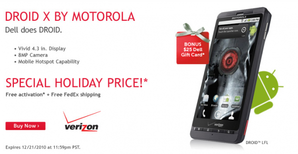 Normally when a phone like the Droid X hits the “FREE” category, that’s a big enough announcement, but Dell has taken it a step further. If you buy a DX from their online store, not only will you get the device for free, but they’ll toss in a $25 gift card with it. Not bad right? We saw this same deal for the Incredible last month, but Dell decided to step their game up for a last minute X-mas push using almost all of the Droid devices. You will find this $25 gift card deal for the Incredible (again), Pro and DX. Who’s buying?