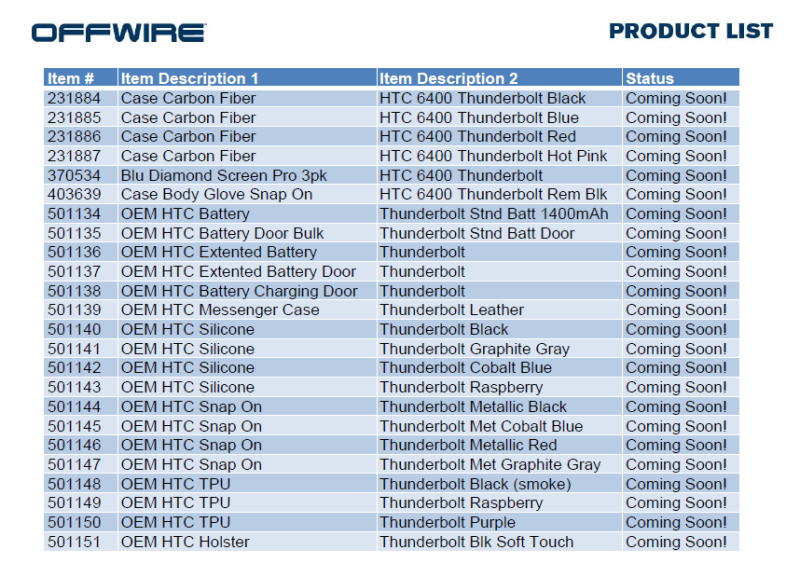 It’s pretty widely known that accessory companies receive dummy units of phones long before they ever hit store shelves in order to put together their line of products, so it’s not super surprising that HTC Thunderbolt (our gallery) accessories would start popping up early. What is interesting, is the fact that accessory distributor OffWire, is sending out emails to their clients recommending that they start pre-ordering products for the device right away. We’ve also got word from our tipster that when notified about accessories from this particular distributor, the device usually launches 2-3 weeks later. For example, Droid Pro accessories went live on OffWire two weeks before it landed on Verizon.