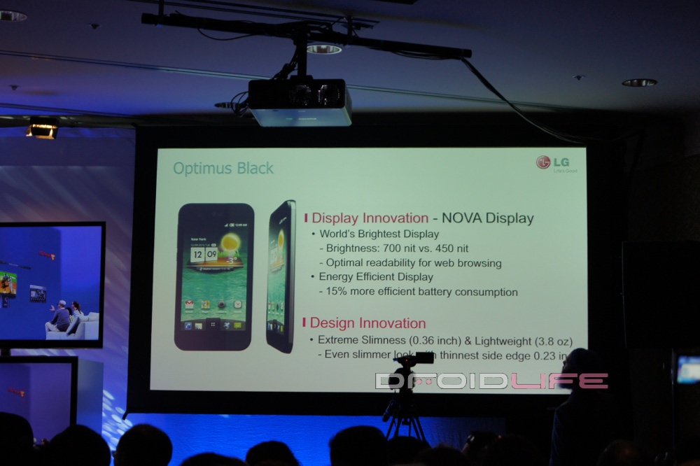 We’re sitting at the LG CES event and they’ve just announced the new Optimus Black which is the “world’s thinnest” smartphone and has this amazing new NOVA display. This phone made an appearance a few weeks ago as the LG “B” showing off its super bright screen, all while laughing at the i*hone.