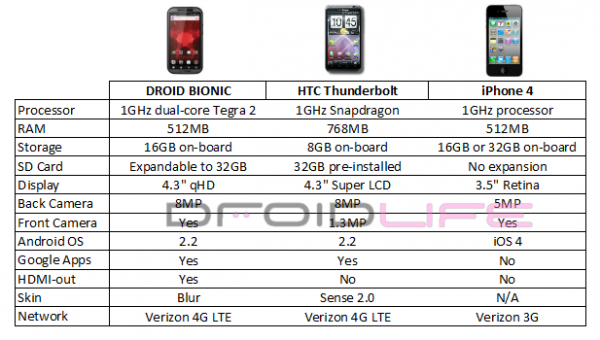 We just wanted to toss this chart out there to give you an idea of how to compare the i*hone 4 on Verizon to the top 4G LTE devices (DROID BIONIC and HTC Thunderbolt) that we should be seeing in just a few months. Other than the fact that the i*hone won’t and can’t run on the new 4G LTE network from Big Red, there are some other big differences here that you should be focused on. Actually, I’m not sure any are bigger than that fact, but we’ll continue on anyway.