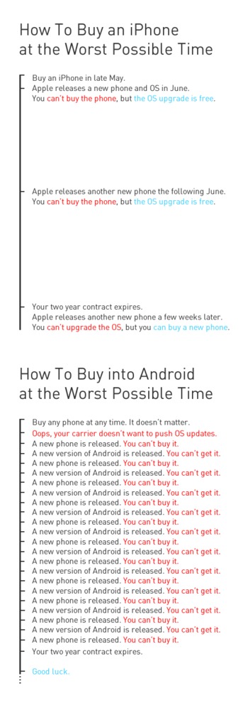 The graphic above attempts to lay out the timeline for the “worst possible time” to buy an i*hone or an Android phone, leaving our side of the world looking a little silly. Funny thing is, it fits right into this week’s theme, “Updates or die!” What do I take from this? This just proves that we have choices. Instead of waiting for June each year, we have the option to choose a device at any time and from any carrier, and THAT is not a bad thing. Obviously you buy something and then get locked into it for two years, but as long as you educate yourself and buy a decent phone that isn’t the LG Ally or anything with Samsung branding on it, you should be good. As far as updates are concerned though, I’m not about to go there.
