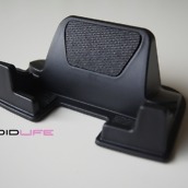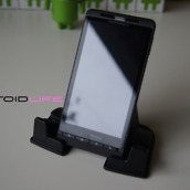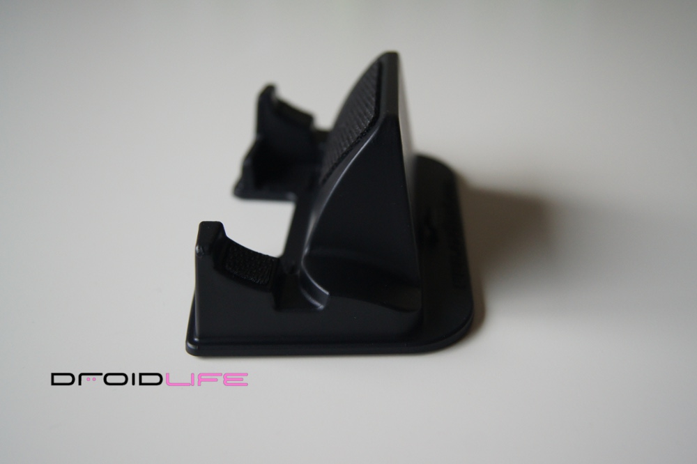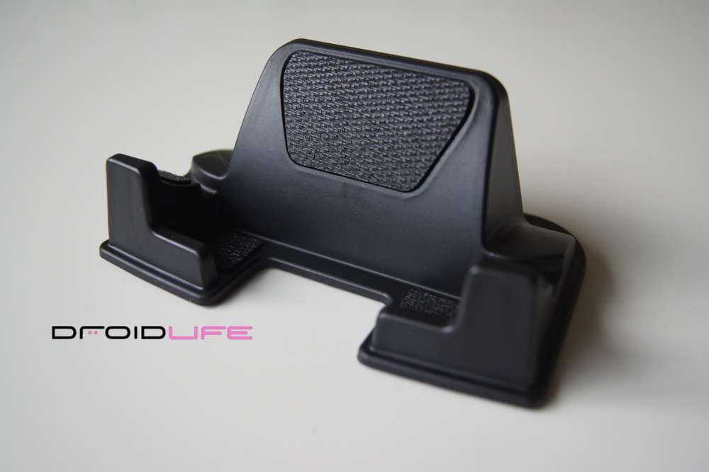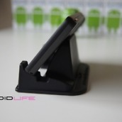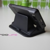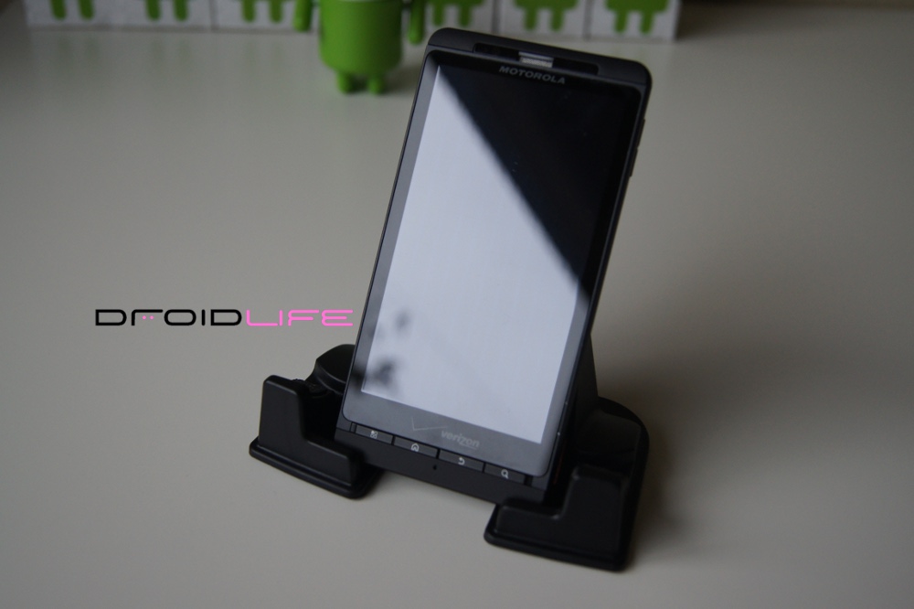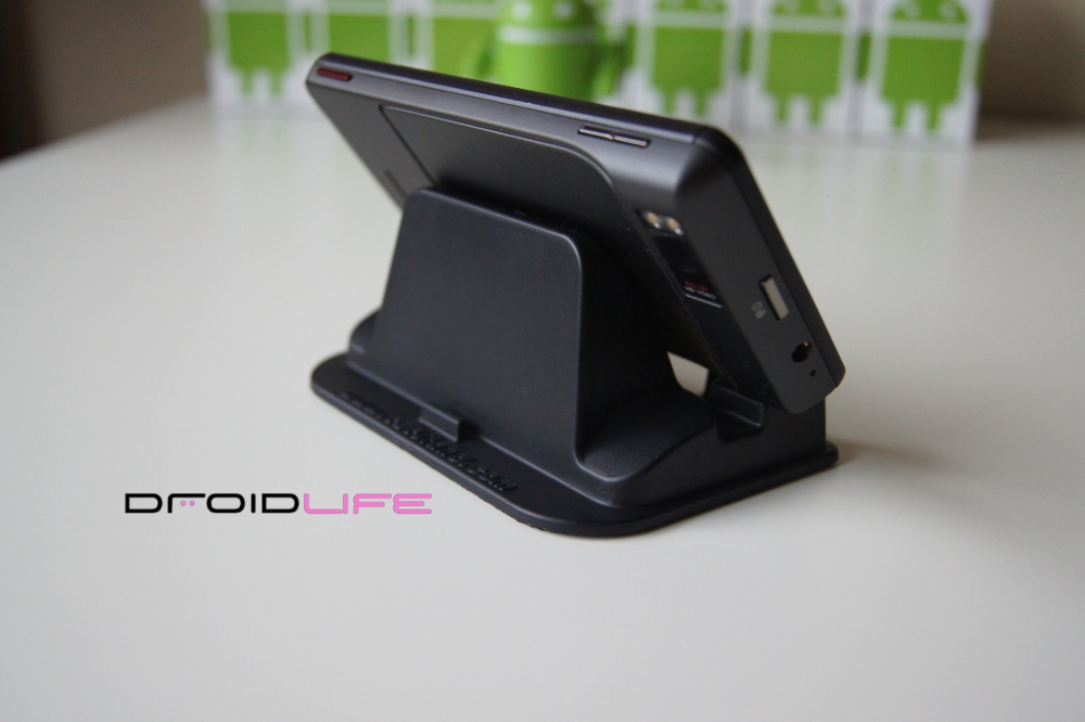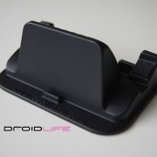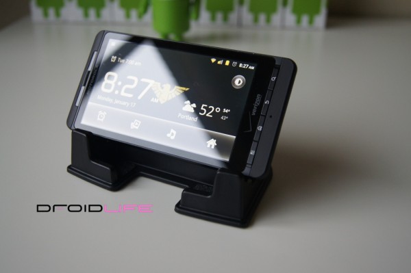 This new version was made specifically for all those big devices/”hummers” out there, like our friend the DROID X and the HTC EVO. The base has been widened and will fit any phone in portrait measuring in at 2.85″ which is pretty impressive. In fact, with my DX docked, I’ve easily got another .5″ of breathing room, so I would have no issue even if I slapped a case on it.