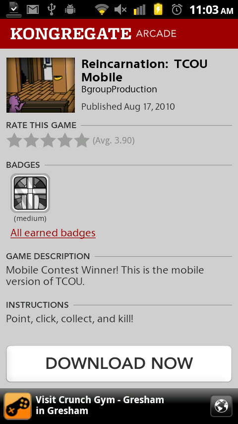 This new app allows for mobile-only badges, high scores, ratings, comments, and offline play (+100!). Yes, I just said “offline play.” It uses your Kongregate web account and they’ll even toss int 50 points when you install the app for the first time.