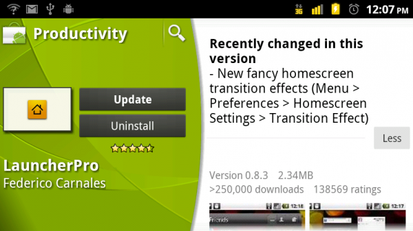 Just as we said this morning, a LauncherPro update including fancy screen transitions would be out this week and sure enough, it’s ready and in the market. We’re installing ours now, so keep close to this post as we’ll have more…