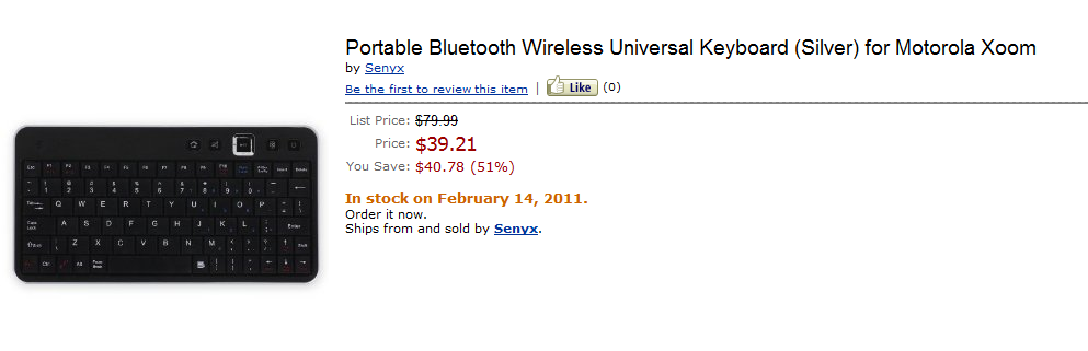 How does February 14th sound as a launch day for the Motorola XOOM? According to Amazon, a bluetooth keyboard made for our first Honeycomb tablet will be “in stock” on Valentine’s Day which has us jumping to the hopeful conclusion that it’ll be in our hands at that same time. We should also point out that our friends over at Phandroid were tipped to the same date, which is the kick off for MWC (Mobile World Congress). While this keyboard is not an “official” accessory, we’re still willing to talk about it because the XOOM is just that awesome.