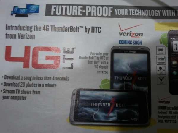 The release date for the HTC Thunderbolt is the silliest thing in mobile these days. The device is ready, has been previewed by every tech site on the planet (our hands-on gallery and video), and has absolutely zero secrets except for when it will actually be released to the world. Will it be the 14th or the 24th? We still have no idea, but we do know that Best Buy is prepping to take pre-orders for it that will cost you $50 according to their new ad. Of course, this news is also coupled with a “coming soon” tag which shouldn’t surprise anyone at this point.