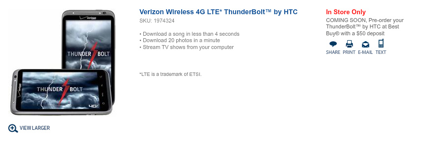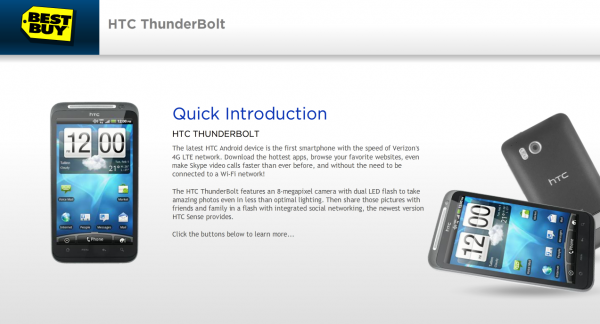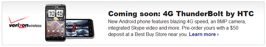 It looks like the pre-order for the HTC Thunderbolt is all set for February 6th if you’ve got an extra $50 laying around. The intro page for the device on Best Buy’s site is live, but we still don’t have an official release date. We’re assuming it’s the 14th which our friends at Phandroid first brought up long ago, but the 24th or 11th could be options. Not sure why the secrecy or why they can’t pick a time and let the world know, but the phone will be here in the next couple of weeks for sure.