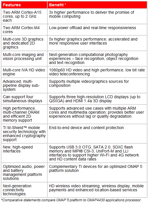 At first, this news about Texas Instruments’ new OMAP 5 may come across as too little too late when you look at what NVIDIA and Qualcomm are doing in the mobile processing game, but then you read the stat sheet and realize they still have a chance. Their new multi-core OMAP 5 will sport two ARM Cortex-A15 cores that can each be clocked up to 2Ghz, but will also have two separate Cortex-M4 cores for offloading real-time processing from the Cortex-A15 cores to “improve low-level control and responsiveness.” They expect to see 3x the overall performance and a 5x graphics improvement as compared to their OMAP 4, but with a 60 percent power reduction. Talk about a beast.