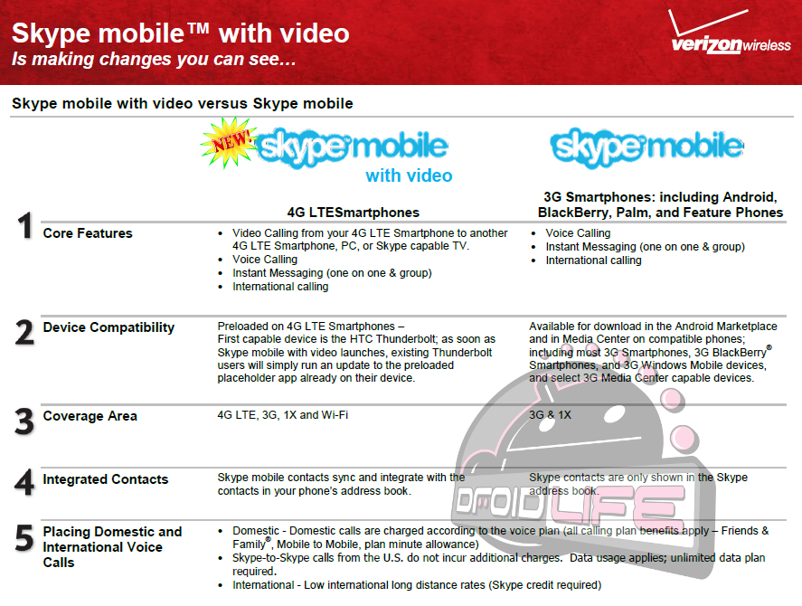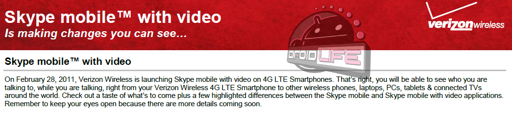 We’ve also received a comparison chart of the different versions of Skype from our friends at Verizon that highlights some of the new features we can expect once our new 4G LTE devices launch. The first thing that stuck out to me was the fact that Skype Mobile with Video will be baked into your phone’s address book, giving you quick access to video calls with your friends. It will also allow you to make video calls to other 4G LTE devices, PCs, and to Skype-capable TVs. And of course, you can make calls over 4G, 3G, 1X and WiFi which as we all know, is something a certain other phone can’t do.