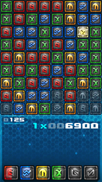 Once combinations are exhausted, the leftovers turn to stone; any tiles cleared next to these stone pieces, however, become active again. If played unwisely, this can lead to a very limited playing space. Play continues until there are literally no more moves, but I haven’t reached this yet. As you clear runes of a color, meters at the bottom for each color fill. When topped up, they provide a score bonus for that color, and when activated, clear all the tiles of that type. This leads to a very strategic usage: you don’t want to waste that score bonus with few tiles on the field.
