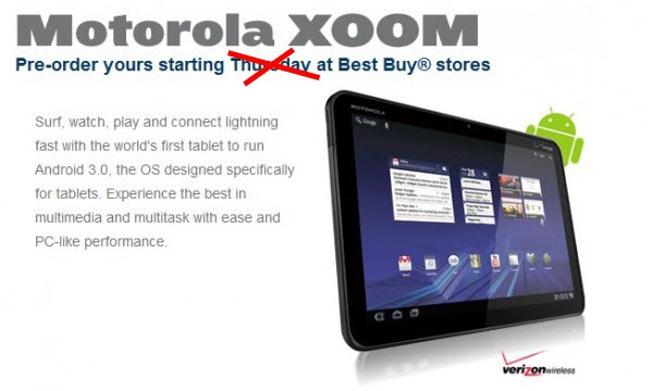 Last week, our friends at Best Buy told us that a pre-sale for the Motorola XOOM would begin on February 17th and when the landing page for it accidentally went live a few days later confirming that, most of us had already scheduled our Thursday trip to a store. Well hold on to those car keys, folks. We’re hearing now that the pre-sale may have been moved to the 20th to comply with some sort of Motorola request.