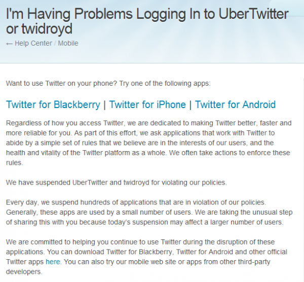 Uh oh. Twitter has found some issues in a variety of apps on Android and decided to suspend them for the time being. Topping the list is twidroyd (UberTwitter for Blackberry), which as you all know, is one of the biggest Twitter apps and has thousands and thousands of users. It’s unclear exactly what they’ve all done to warrant this reaction from Twitter, so we’ll hold off from taking sides at this time. The support thread above simply states that they have violated policies, but goes into plenty of indirect points as to why they may have dropped the hammer. Interesting stuff. We always try to recommend that readers go with Hootsuite, Tweetdeck or Seesmic anyway.