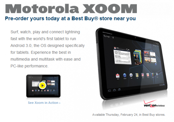 Well, it’s back. BestBuy.com/Xoom has returned and is reminding you that today is the pre-order day for the world’s first Honeycomb tablet. This was originally going to happen on the 17th, but a last minute contract reminder from Moto caused BBY to move it to the 20th. No price has been listed yet, but we’re still expecting it to come in at $799. The page also looks like it isn’t 100% ready for mass-viewing, so we’ll be keeping an eye on it to hopefully put some closure to all things XOOM.