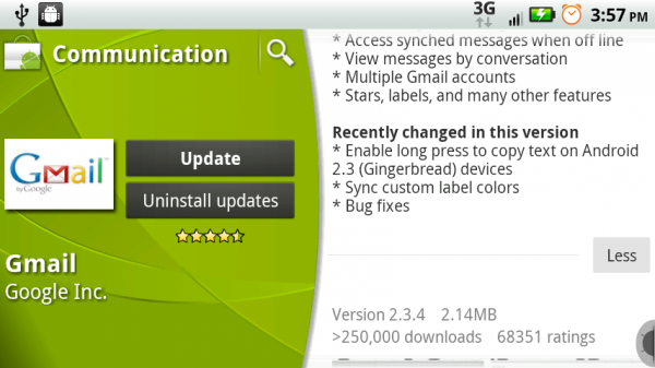 A minor Gmail update is waiting for you in the Android Market that brings text copying to Gingerbread users and label color syncing to everyone else. And yeah, that’s pretty much it. Go get it now! Market Link.