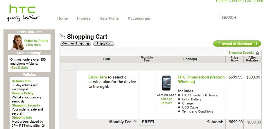 And the last bit of news is pretty random, but actually comes off as positive if it ends up sticking. We had a few tipsters submit the picture you’ll see below which is of a shopping cart on HTC’s site with the Thunderbolt inside of it. The $699 price is the real story here, especially after seeing $749 from Best Buy over and over again and actually almost had us cracking a miniature smile.