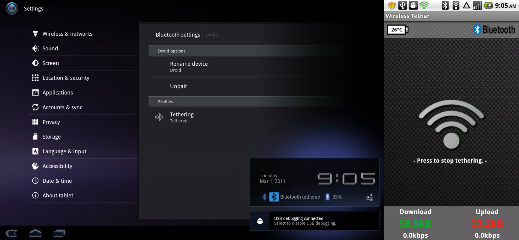 Yesterday we put together our guide on how to wireless tether your DROID X to your Motorola XOOM, but wanted to make sure we covered all of the original DROID members out there as well. And since the original DROID creates an ad-hoc spot rather than infrastructure like the DX or various other phones, a standard wireless tether won’t work, so we have to go with Bluetooth instead. Luckily, the Wireless Tethering app from the market has a Bluetooth option, and that’s exactly what we’ll be using here. I should also point out that this method does require that you root your original DROID, but for those of you with a DX, D2 or Pro, you can apparently do this without rooting.