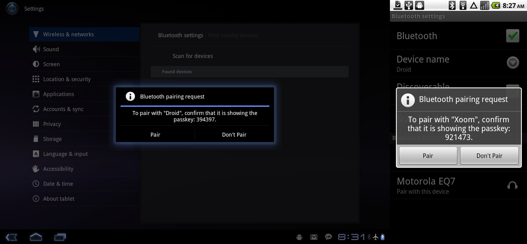 9. From your XOOM tap on “DROID” and “Pair” both devices when prompted.