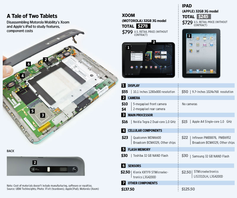 It’s pretty hard for anyone to argue that the Motorola XOOM is not an incredible product, but that hasn’t stopped the onslaught of angry would-be customers over its $799 premium price tag. And thanks to the WSJ, we can see the exact breakdown for the pricing of each component and how it compares similarly to that of the original iPad. The numbers are definitely close even with a bigger/better screen, dual-core processor and 2 different cameras, but it’s hard to forget the fact that the iPad2 is going to be announced tomorrow and will have newer parts than the original at roughly the same cost. They’ll also likely introduce a cheap WiFi-only version which will appeal and sell to an enormous market, while Sanjay and the boys spend time twiddling their thumbs over when to release theirs.