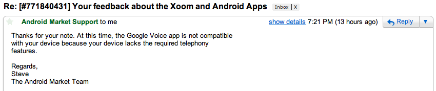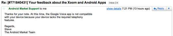 Opening the new Honeycomb market and searching for “Google Voice” was probably the first thing I did after grabbing my Motorola XOOM last Thursday and it was no where to be found. Not being pleased with this discovery, especially knowing that my XOOM has a Verizon phone number tied to it, I started asking around on Twitter and apparently many of you found out the hard way as well. And don’t bother sideloading it either, because it’ll force close on you.