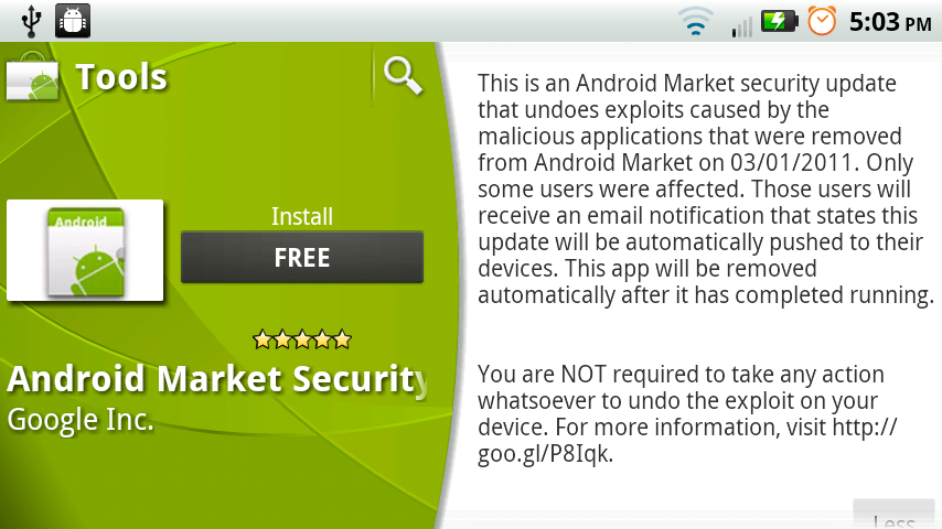 - We are pushing an Android Market security update to all affected devices that undoes the exploits to prevent the attacker(s) from accessing any more information from affected devices. If your device has been affected, you will receive an email from android-market-support@google.com over the next 72 hours. You will also receive a notification on your device that “Android Market Security Tool March 2011” has been installed. You may also receive notification(s) on your device that an application has been removed. You are not required to take any action from there; the update will automatically undo the exploit. Within 24 hours of the exploit being undone, you will receive a second email.