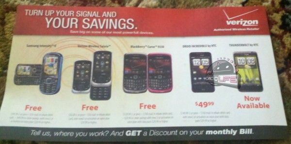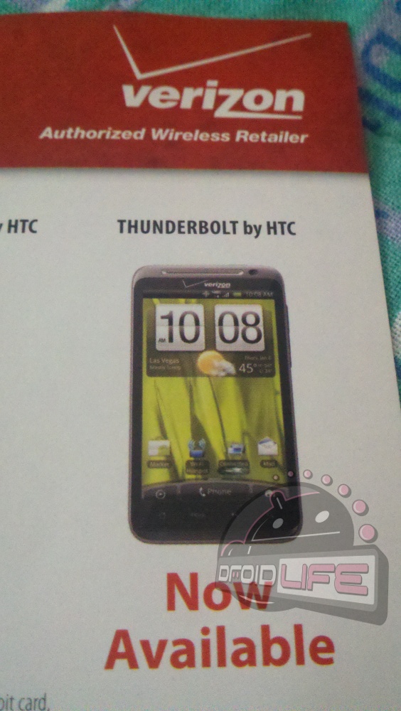 This is really just one evil tease, but don’t blame the messenger on this one. From the photos we just received of new flyers that are arriving at the homes of current VZW customers, you can see that Verizon fully expected their first 4G LTE device, the HTC Thunderbolt to be out by now. Well, at least their “authorized retailers” sure did.