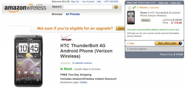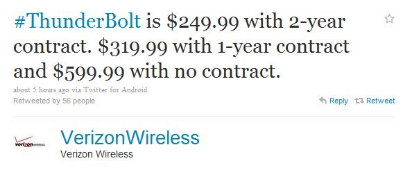 Talk about a steal of a deal right there. Who wouldn’t jump all over an HTC Thunderbolt for $179 on contract? Oh, and you’ll notice the full retail price is listed at $749 which is odd since Verizon tweeted that it would be $599 just a couple of hours ago from them and just $319 on a 1-year contract. Silly Amazon.