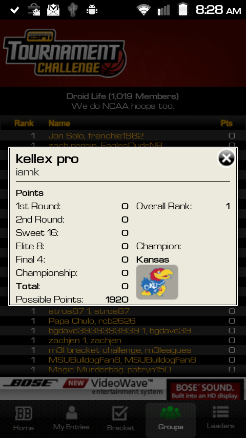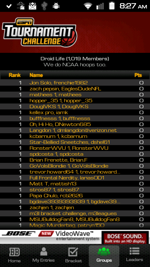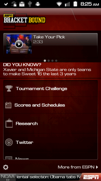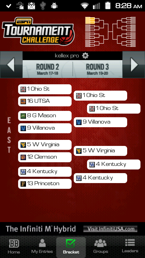 If you joined the Droid Life Tourney Challenge, then you’ll want to grab the ESPN Bracket Bound app to keep track of my dominance over the 1000+ that decided to battle it out this year. The app is free in the market, allows you to track your bracket, your standings in any of your groups, and even view the overall leaders in the entire country. It’s actually a pretty solid attempt here by ESPN.