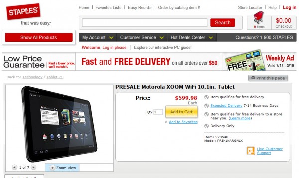 The Motorola XOOM Wi-Fi is approaching faster than I think anyone expected. A pre-sale started this morning at Costco, and now Staples has joined in on the party. As you may remember, our friends at Staples helped us spread a lot of news about this wifi-only XOOM, so we’ve got to show them some love now that the device can finally be ordered. It’s $599, will ship on March 25th, and should arrive on either the 27th or 28th. Yay!