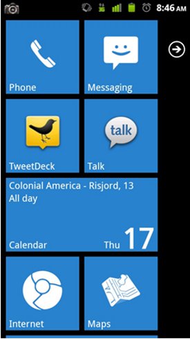 This is where Launcher 7 really shines over and against other WP7 launcher imitations. There are options for live tiles, like the calendar tile you see above. The calendar tile will cycle through your 24 hour events or display an event that is coming up that day. Another option for live tiles is a People tile, which displays pictures of your various contacts. For those familiar with WP7, you’ll recognize that these live tiles are straight from the WP7 launcher. While the options for these lives tiles are limited right now, there is a lot of potential to make the app even more like WP7 and then to expand beyond with custom live tiles.